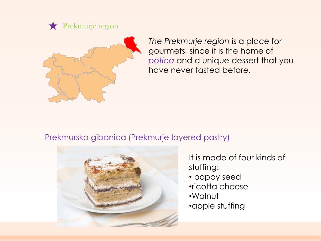 Prekmurje region The Prekmurje region is a place for gourmets, since it is the home ofpoticaand a unique dessert that you have never tasted before. Prekmurska gibanica (Prekmurje layeredpastry) • It is madeoffourkindsofstuffing: • poppy seed • ricotta cheese • Walnut • apple stuffing