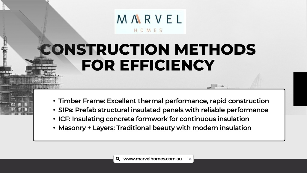 CONSTRUCTION METHODS FOR EFFICIENCY • Timber Frame: Excellent thermal performance, rapid construction • SIPs: Prefab structural insulated panels with reliable performance • ICF: Insulating concrete formwork for continuous insulation • Masonry + Layers: Traditional beauty with modern insulation www.marvelhomes.com.au