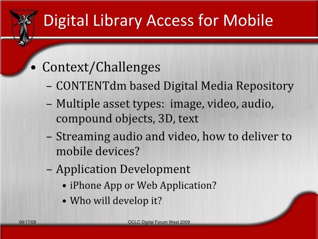 Digital Library Access for Mobile • Why? • To extend access opportunities to digital assets and objects in our collections • To connection the DMR to an increasingly mobile client base • To extend the value of research material • To deliver multimedia objects that work well on modern mobile devices and networks OCLC Digital Forum West 2009