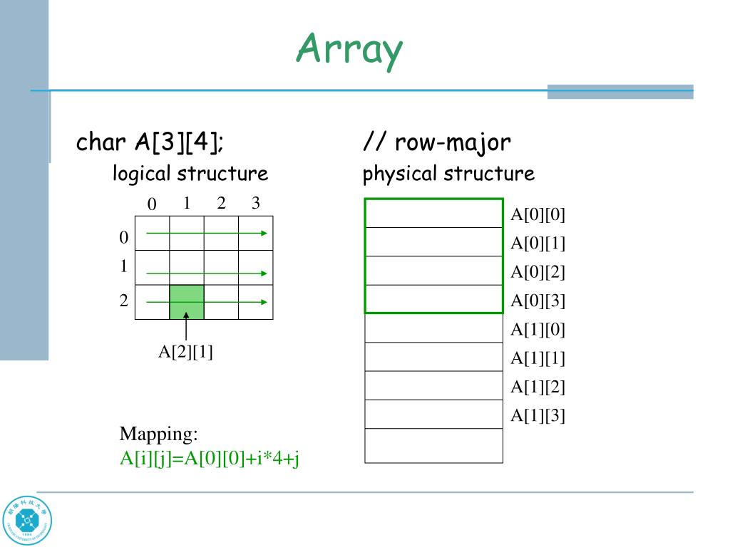 Array char A[3][4]; // row-major logical structure physical structure 1 2 3 0 A[0][0] 0 A[0][1] 1 A[0][2] 2 A[0][3] A[1][0] A[2][1] A[1][1] A[1][2] A[1][3] Mapping: A[i][j]=A[0][0]+i*4+j
