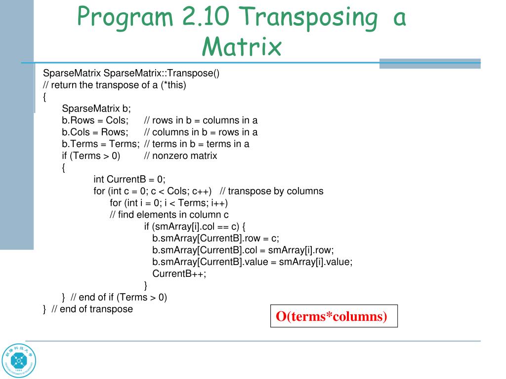 Program 2.10 Transposing a Matrix SparseMatrix SparseMatrix::Transpose() // return the transpose of a (*this) { SparseMatrix b; b.Rows = Cols; // rows in b = columns in a b.Cols = Rows; // columns in b = rows in a b.Terms = Terms; // terms in b = terms in a if (Terms > 0) // nonzero matrix { int CurrentB = 0; for (int c = 0; c < Cols; c++) // transpose by columns for (int i = 0; i < Terms; i++) // find elements in column c if (smArray[i].col == c) { b.smArray[CurrentB].row = c; b.smArray[CurrentB].col = smArray[i].row; b.smArray[CurrentB].value = smArray[i].value; CurrentB++; } } // end of if (Terms > 0) } // end of transpose O(terms*columns)