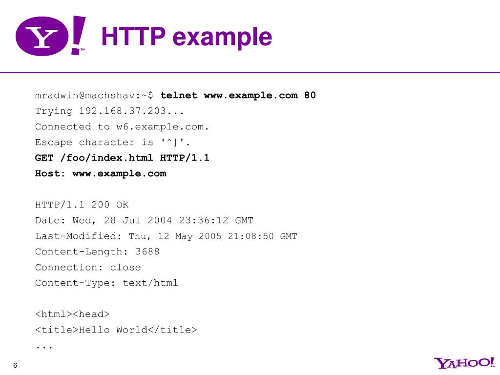 HTTP example mradwin@machshav:~$telnet www.example.com 80 Trying 192.168.37.203... Connected to w6.example.com. Escape character is '^]'. GET /foo/index.html HTTP/1.1 Host: www.example.com HTTP/1.1 200 OK Date: Wed, 28 Jul 2004 23:36:12 GMT Last-Modified: Thu, 12 May 2005 21:08:50 GMT Content-Length: 3688 Connection: close Content-Type: text/html <html><head> <title>Hello World</title> ...