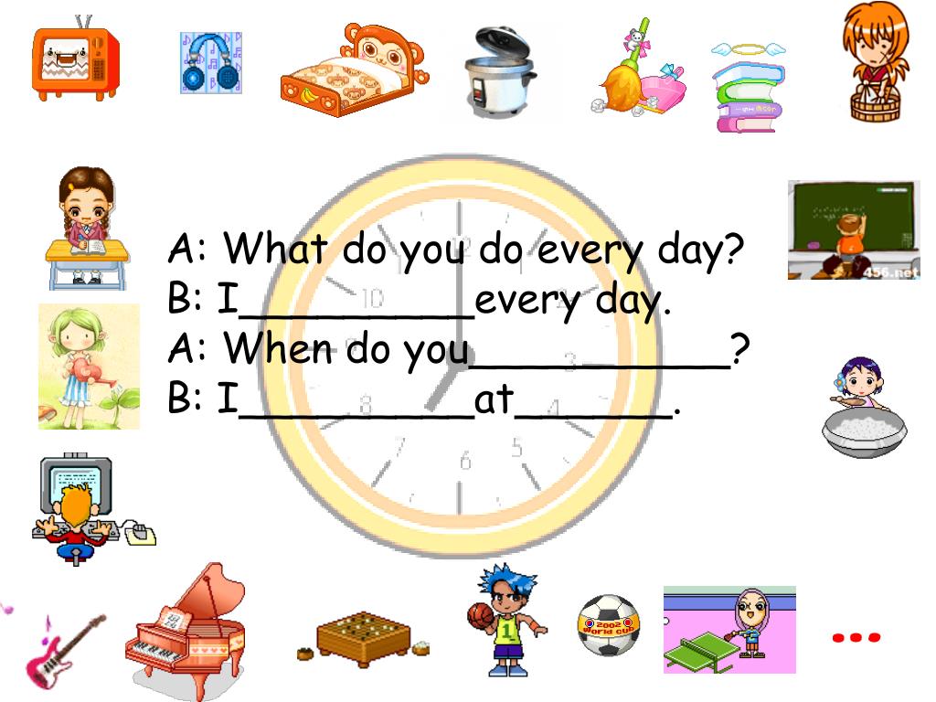 A: What do you do every day? B: I_________every day. A: When do you__________? B: I_________at______. …