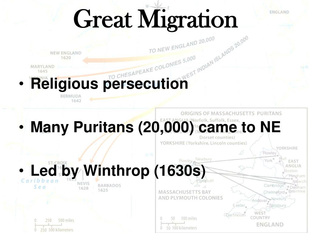 Great Migration • Religious persecution • Many Puritans (20,000) came to NE • Led by Winthrop (1630s)