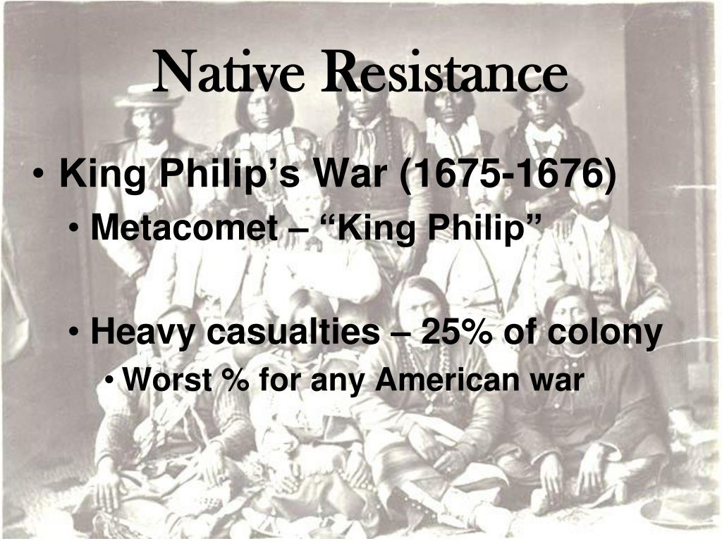 Native Resistance • King Philip’s War (1675-1676) • Metacomet – “King Philip” • Heavy casualties – 25% of colony • Worst % for any American war