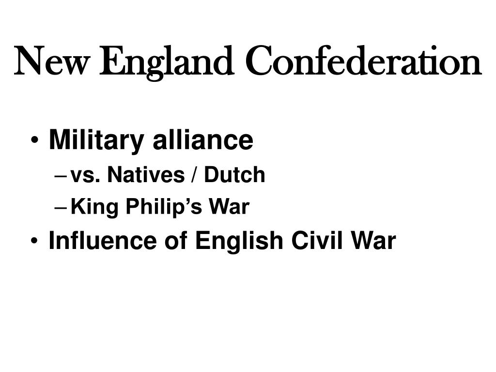 New England Confederation • Military alliance • vs. Natives / Dutch • King Philip’s War • Influence of English Civil War