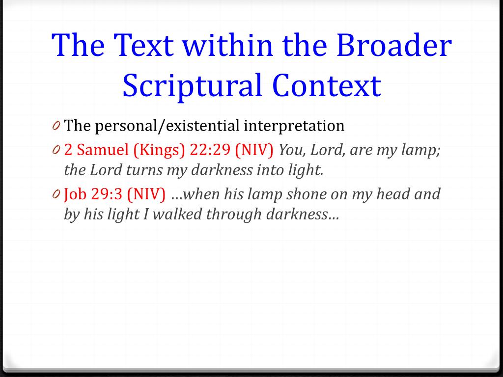 The Text within the Broader Scriptural Context • The personal/existential interpretation • 2 Samuel (Kings) 22:29 (NIV)You, Lord, are my lamp; the Lord turns my darkness into light. • Job 29:3 (NIV) …when his lamp shone on my head and by his light I walked through darkness…