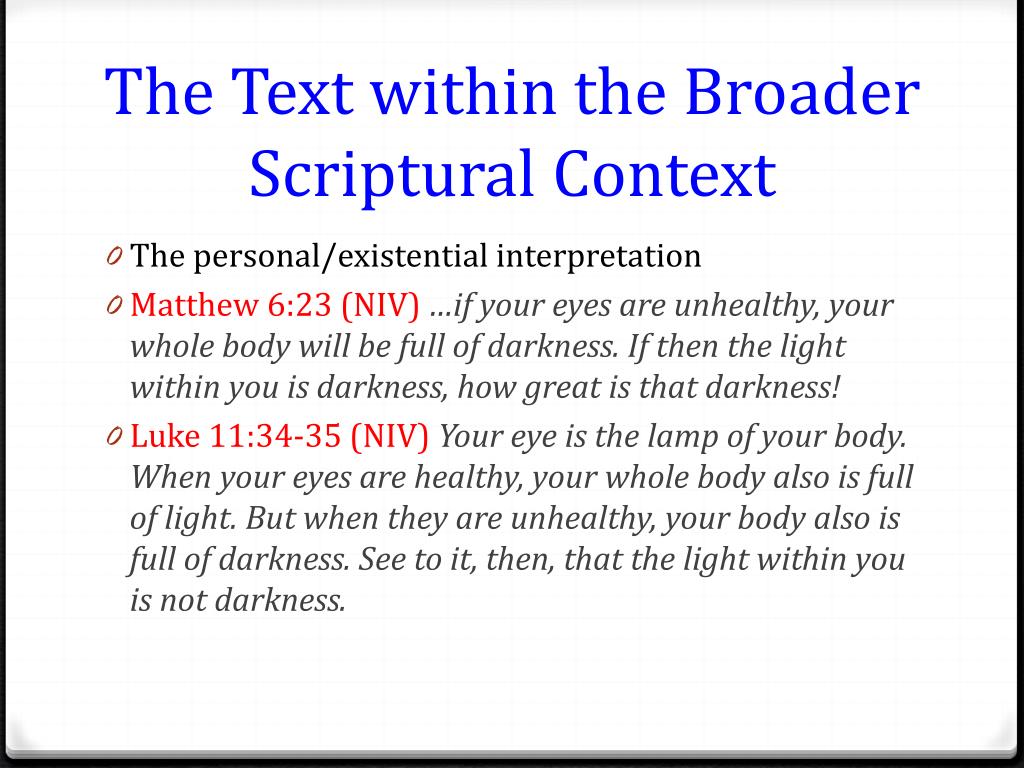 The Text within the Broader Scriptural Context • The personal/existential interpretation • Matthew 6:23 (NIV) …if your eyes are unhealthy, your whole body will be full of darkness. If then the light within you is darkness, how great is that darkness! • Luke 11:34-35 (NIV) Your eye is the lamp of your body. When your eyes are healthy, your whole body also is full of light. But when they are unhealthy, your body also is full of darkness. See to it, then, that the light within you is not darkness.