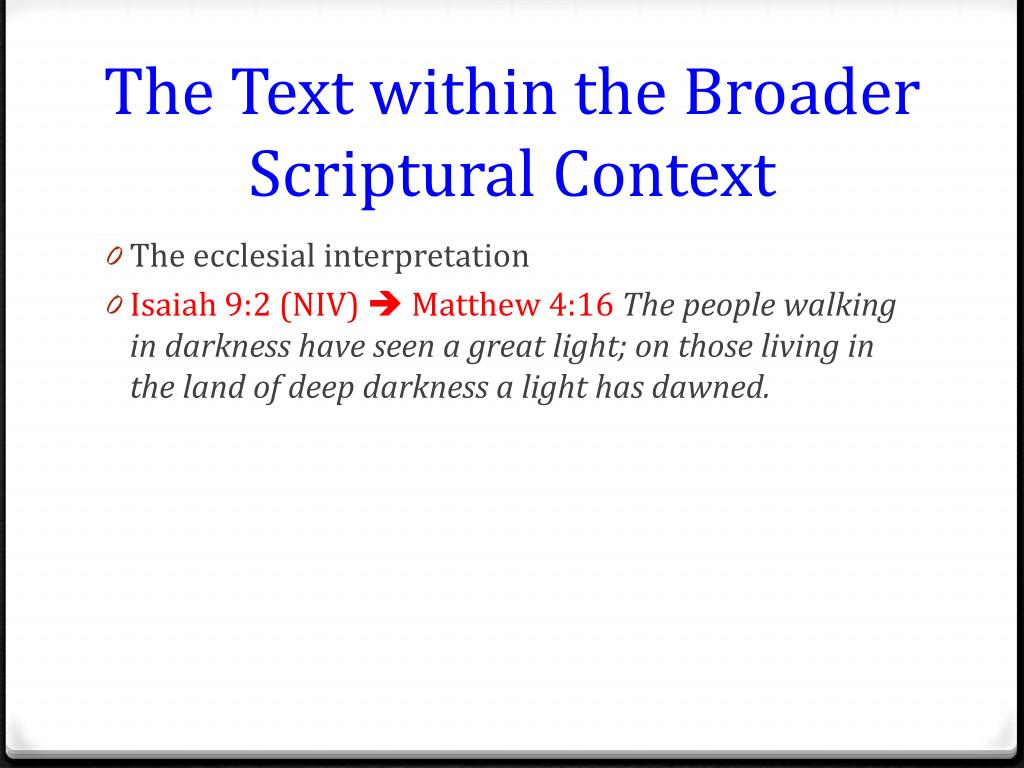 The Text within the Broader Scriptural Context • The ecclesial interpretation • Isaiah 9:2 (NIV) Matthew 4:16 The people walking in darkness have seen a great light; on those living in the land of deep darkness a light has dawned.