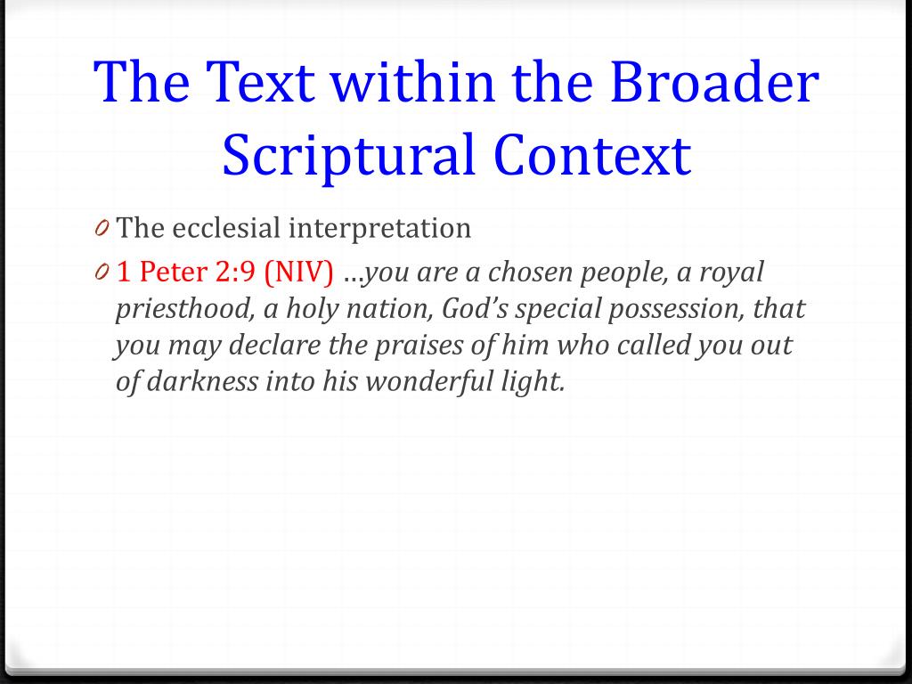 The Text within the Broader Scriptural Context • The ecclesial interpretation • 1 Peter 2:9 (NIV) …you are a chosen people, a royal priesthood, a holy nation, God’s special possession, that you may declare the praises of him who called you out of darkness into his wonderful light.