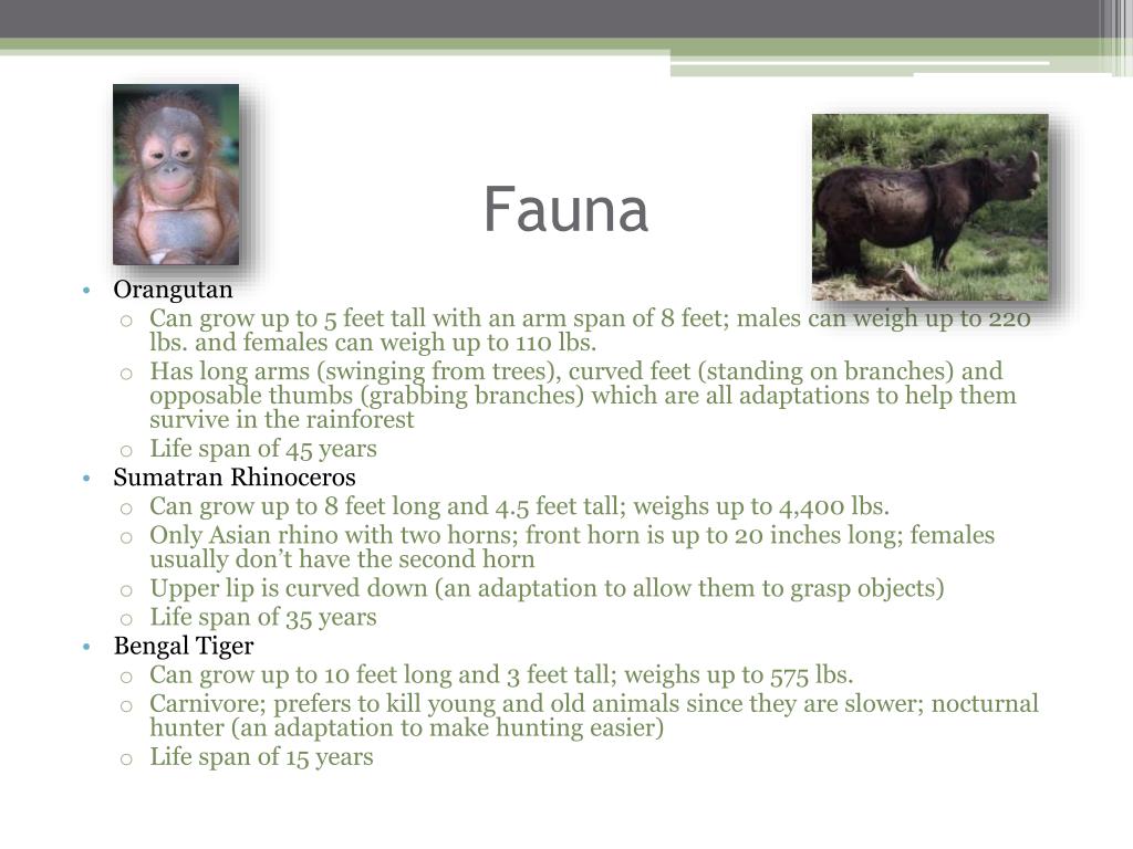 Fauna • Orangutan • Can grow up to 5 feet tall with an arm span of 8 feet; males can weigh up to 220 lbs. and females can weigh up to 110 lbs. • Has long arms (swinging from trees), curved feet (standing on branches) and opposable thumbs (grabbing branches) which are all adaptations to help them survive in the rainforest • Life span of 45 years • Sumatran Rhinoceros • Can grow up to 8 feet long and 4.5 feet tall; weighs up to 4,400 lbs. • Only Asian rhino with two horns; front horn is up to 20 inches long; females usually don’t have the second horn • Upper lip is curved down (an adaptation to allow them to grasp objects) • Life span of 35 years • Bengal Tiger • Can grow up to 10 feet long and 3 feet tall; weighs up to 575 lbs. • Carnivore; prefers to kill young and old animals since they are slower; nocturnal hunter (an adaptation to make hunting easier) • Life span of 15 years