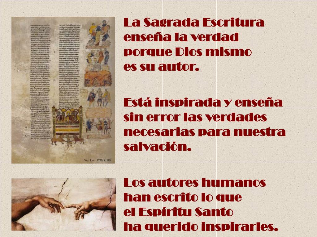 La Sagrada Escritura enseña la verdad porque Dios mismo es su autor. Está inspirada y enseña sin error las verdades necesarias para nuestra salvación. Los autores humanos han escrito lo que el EspírituSanto ha querido inspirarles.