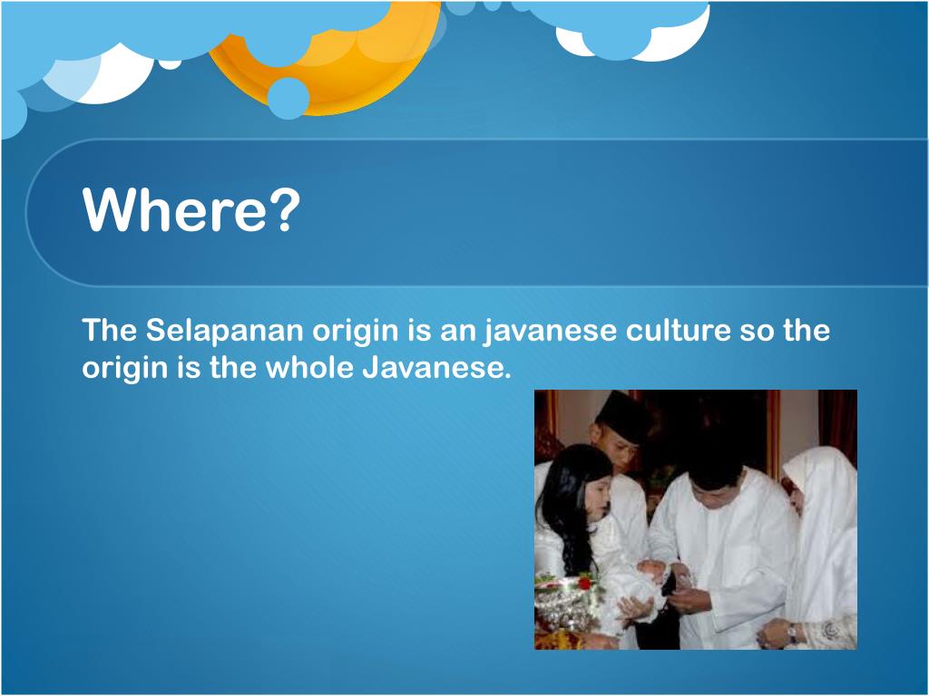 Selapanan. Shannon, BJ, Vella, javier. What is Selapanan?. Selapanan is a ritual of praying, they cut the baby ’ s hair and also the nail of the baby. It was held when the baby is 35 days old. Where?. The Selapanan origin is an javanese culture so the origin is the whole Javanese. When?.