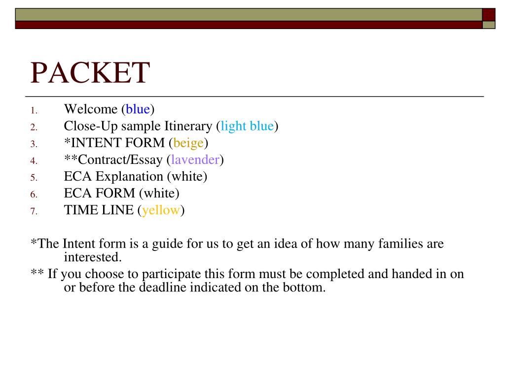 PACKET • Welcome (blue) • Close-Up sample Itinerary (light blue) • *INTENT FORM (beige) • **Contract/Essay (lavender) • ECA Explanation (white) • ECA FORM (white) • TIME LINE (yellow) *The Intent form is a guide for us to get an idea of how many families are interested. ** If you choose to participate this form must be completed and handed in on or before the deadline indicated on the bottom.