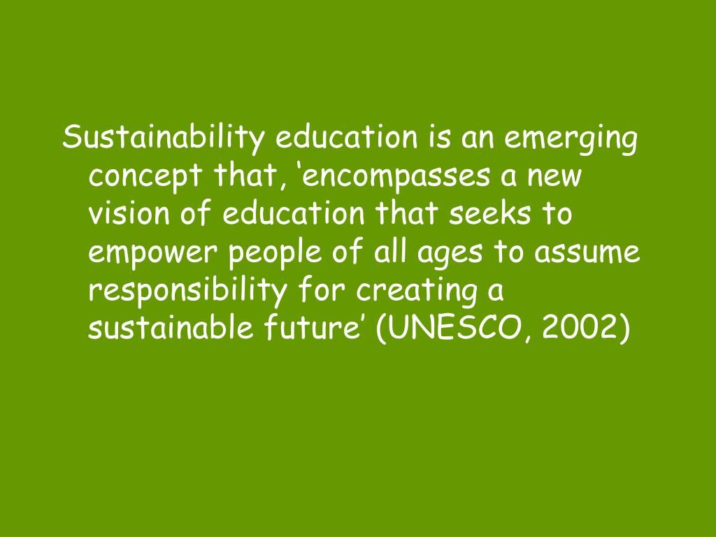 Sustainability education is an emerging concept that, ‘encompasses a new vision of education that seeks to empower people of all ages to assume responsibility for creating a sustainable future’ (UNESCO, 2002)