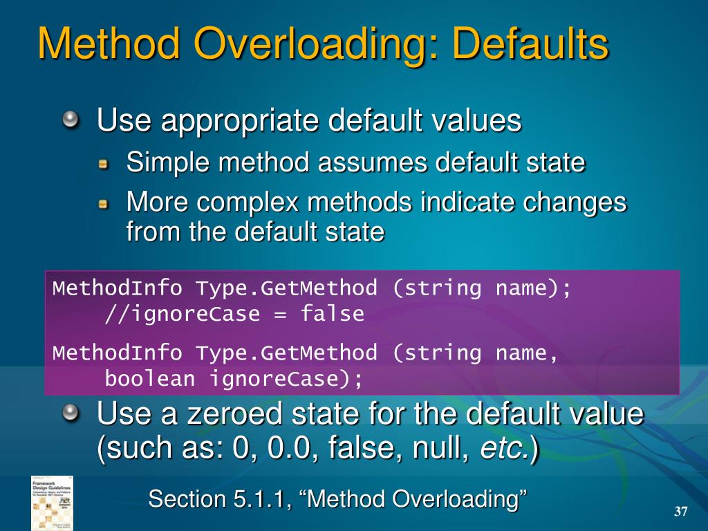 Section 5.1.1, “Method Overloading” Method Overloading: Defaults • Use appropriate default values • Simple method assumes default state • More complex methods indicate changes from the default state • Use a zeroed state for the default value (such as: 0, 0.0, false, null, etc.) MethodInfo Type.GetMethod (string name); //ignoreCase = false MethodInfo Type.GetMethod (string name, boolean ignoreCase);