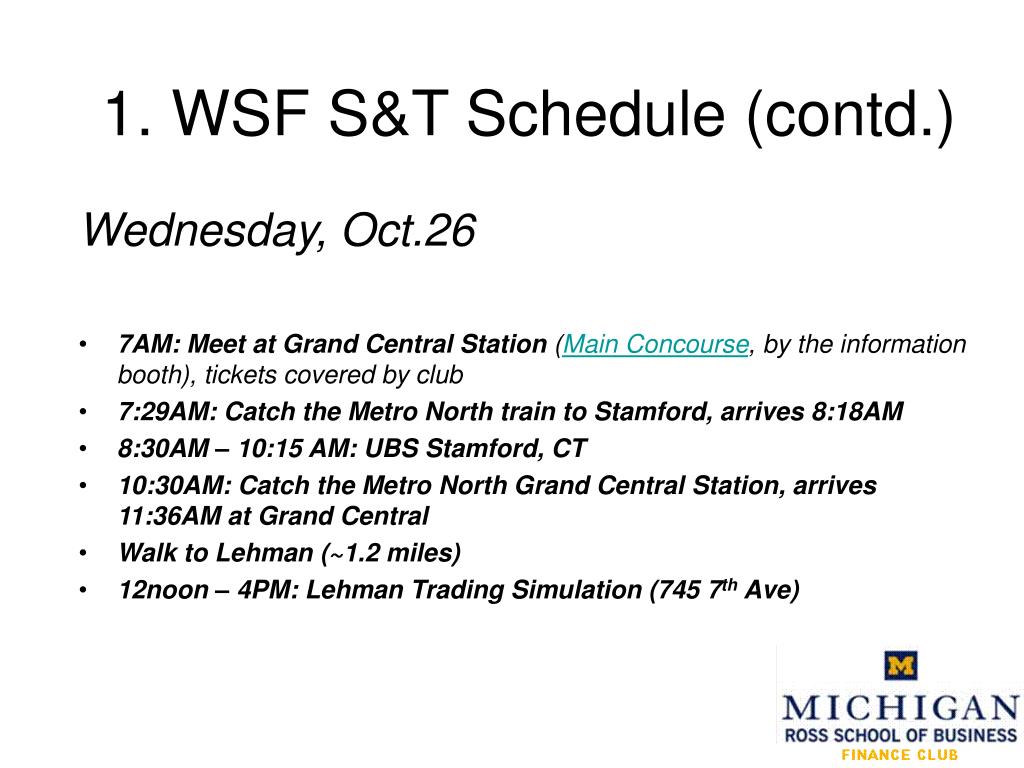 1. WSF S&T Schedule (contd.) Wednesday, Oct.26 • 7AM: Meet at Grand Central Station (Main Concourse, by the information booth), tickets covered by club • 7:29AM: Catch the Metro North train to Stamford, arrives 8:18AM • 8:30AM – 10:15 AM: UBS Stamford, CT • 10:30AM: Catch the Metro North Grand Central Station, arrives 11:36AM at Grand Central • Walk to Lehman (~1.2 miles) • 12noon – 4PM: Lehman Trading Simulation (745 7th Ave)