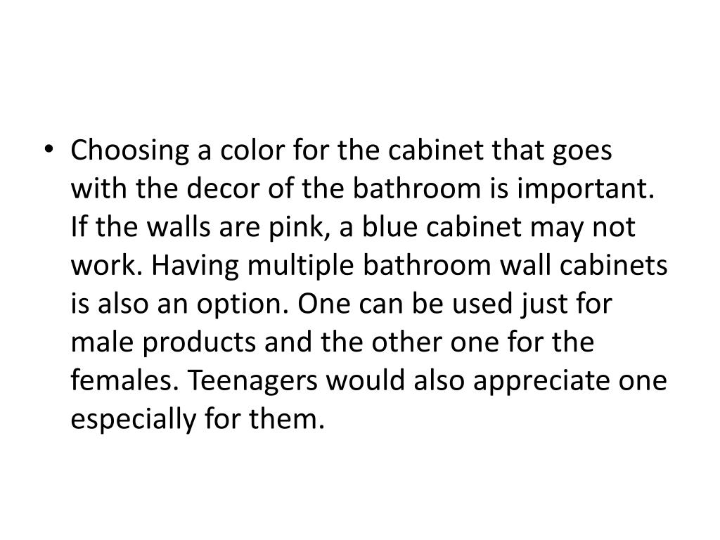 Choosing a color for the cabinet that goes with the decor of the bathroom is important. If the walls are pink, a blue cabinet may not work. Having multiple bathroom wall cabinets is also an option. One can be used just for male products and the other one for the females. Teenagers would also appreciate one especially for them.