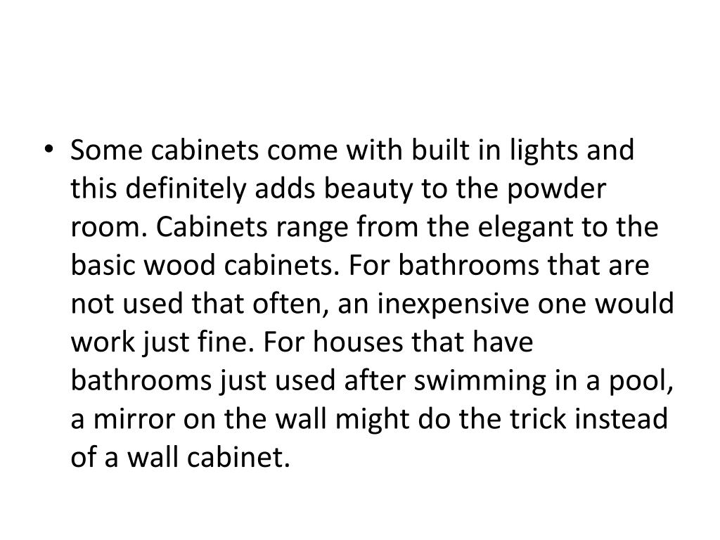 Some cabinets come with built in lights and this definitely adds beauty to the powder room. Cabinets range from the elegant to the basic wood cabinets. For bathrooms that are not used that often, an inexpensive one would work just fine. For houses that have bathrooms just used after swimming in a pool, a mirror on the wall might do the trick instead of a wall cabinet.