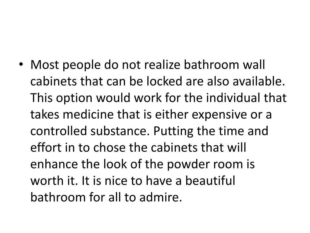 Most people do not realize bathroom wall cabinets that can be locked are also available. This option would work for the individual that takes medicine that is either expensive or a controlled substance. Putting the time and effort in to chose the cabinets that will enhance the look of the powder room is worth it. It is nice to have a beautiful bathroom for all to admire.