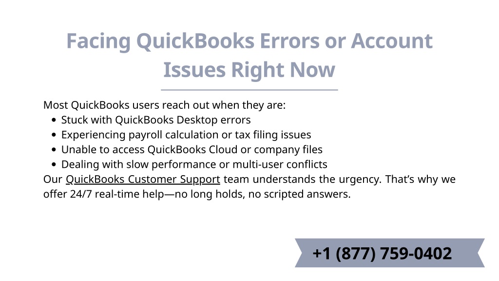 Facing QuickBooks Errors or Account Issues Right Now Most QuickBooks users reach out when they are: Stuck with QuickBooks Desktop errors Experiencing payroll calculation or tax filing issues Unable to access QuickBooks Cloud or company files Dealing with slow performance or multi-user conflicts Our QuickBooks Customer Support team understands the urgency. That’s why we offer 24/7 real-time help—no long holds, no scripted answers. +1 (877) 759-0402