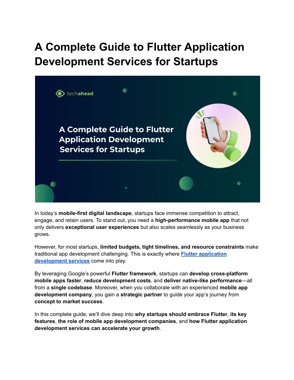 A Complete Guide to Flutter Application Development Services for Startups In today’s mobile-first digital landscape, startups face immense competition to attract, engage, and retain users. To stand out, you need a high-performance mobile app that not only delivers exceptional user experiences but also scales seamlessly as your business grows. However, for most startups, limited budgets, tight timelines, and resource constraints make traditional app development challenging. This is exactly where Flutter application development services come into play. By leveraging Google’s powerful Flutter framework, startups can develop cross-platform mobile apps faster, reduce development costs, and deliver native-like performance—all from a single codebase. Moreover, when you collaborate with an experienced mobile app development company, you gain a strategic partner to guide your app’s journey from concept to market success. In this complete guide, we’ll dive deep into why startups should embrace Flutter, its key features, the role of mobile app development companies, and how Flutter application development services can accelerate your growth.