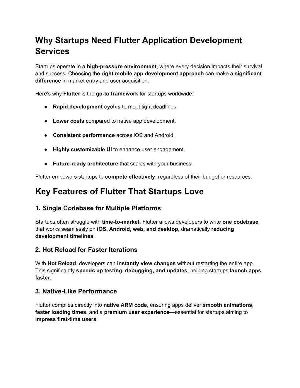 Why Startups Need Flutter Application Development Services Startups operate in a high-pressure environment, where every decision impacts their survival and success. Choosing the right mobile app development approach can make a significant difference in market entry and user acquisition. Here’s why Flutter is the go-to framework for startups worldwide: ● Rapid development cycles to meet tight deadlines. ● Lower costs compared to native app development. ● Consistent performance across iOS and Android. ● Highly customizable UI to enhance user engagement. ● Future-ready architecture that scales with your business. Flutter empowers startups to compete effectively, regardless of their budget or resources. Key Features of Flutter That Startups Love 1. Single Codebase for Multiple Platforms Startups often struggle with time-to-market. Flutter allows developers to write one codebase that works seamlessly on iOS, Android, web, and desktop, dramatically reducing development timelines. 2. Hot Reload for Faster Iterations With Hot Reload, developers can instantly view changes without restarting the entire app. This significantly speeds up testing, debugging, and updates, helping startups launch apps faster. 3. Native-Like Performance Flutter compiles directly into native ARM code, ensuring apps deliver smooth animations, faster loading times, and a premium user experience—essential for startups aiming to impress first-time users.