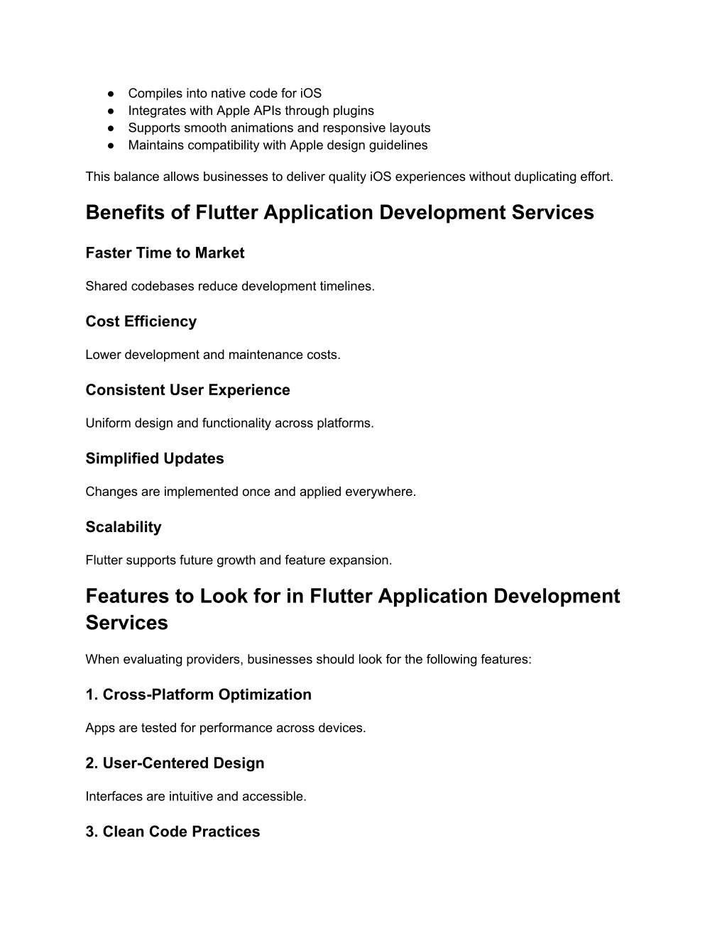 ● Compiles into native code for iOS ● Integrates with Apple APIs through plugins ● Supports smooth animations and responsive layouts ● Maintains compatibility with Apple design guidelines This balance allows businesses to deliver quality iOS experiences without duplicating effort. Benefits of Flutter Application Development Services Faster Time to Market Shared codebases reduce development timelines. Cost Efficiency Lower development and maintenance costs. Consistent User Experience Uniform design and functionality across platforms. Simplified Updates Changes are implemented once and applied everywhere. Scalability Flutter supports future growth and feature expansion. Features to Look for in Flutter Application Development Services When evaluating providers, businesses should look for the following features: 1. Cross-Platform Optimization Apps are tested for performance across devices. 2. User-Centered Design Interfaces are intuitive and accessible. 3. Clean Code Practices