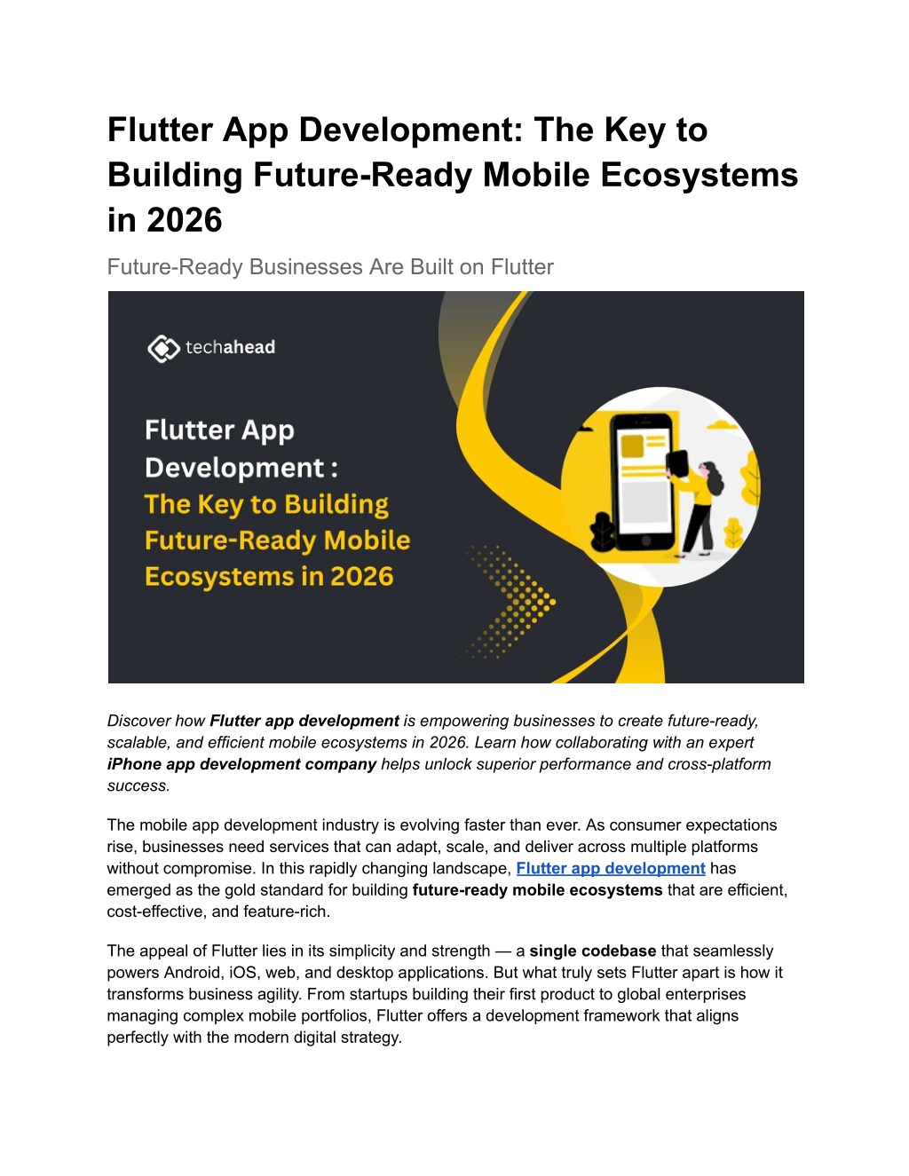 1. Flutter App Development: The Key to Building Future-Ready Mobile Ecosystems in 2026 Future-Ready Businesses Are Built on Flutter Discover how Flutter app development is empowering businesses to create future-ready, scalable, and efficient mobile ecosystems in 2026. Learn how collaborating with an expert iPhone app development company helps unlock superior performance and cross-platform success. The mobile app development industry is evolving faster than ever. As consumer expectations rise, businesses need services that can adapt, scale, and deliver across multiple platforms without compromise. In this rapidly changing landscape, Flutter app development has emerged as the gold standard for building future-ready mobile ecosystems that are efficient, cost-effective, and feature-rich. The appeal of Flutter lies in its simplicity and strength — a single codebase that seamlessly powers Android, iOS, web, and desktop applications. But what truly sets Flutter apart is how it transforms business agility. From startups building their first product to global enterprises managing complex mobile portfolios, Flutter offers a development framework that aligns perfectly with the modern digital strategy.