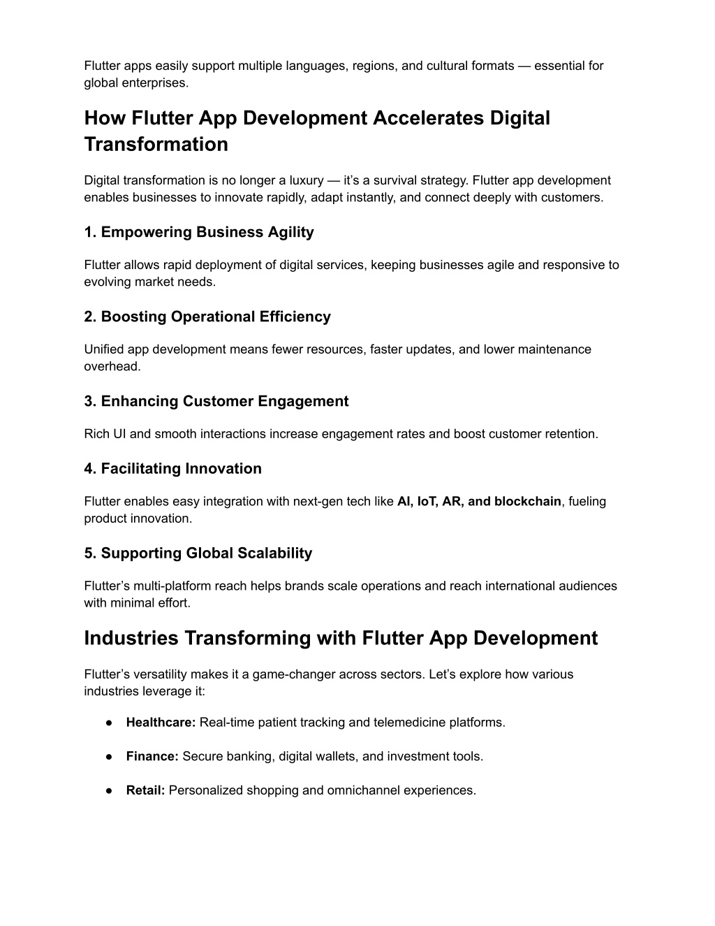 5. Flutter apps easily support multiple languages, regions, and cultural formats — essential for global enterprises. How Flutter App Development Accelerates Digital Transformation Digital transformation is no longer a luxury — it’s a survival strategy. Flutter app development enables businesses to innovate rapidly, adapt instantly, and connect deeply with customers. 1. Empowering Business Agility Flutter allows rapid deployment of digital services, keeping businesses agile and responsive to evolving market needs. 2. Boosting Operational Efficiency Unified app development means fewer resources, faster updates, and lower maintenance overhead. 3. Enhancing Customer Engagement Rich UI and smooth interactions increase engagement rates and boost customer retention. 4. Facilitating Innovation Flutter enables easy integration with next-gen tech like AI, IoT, AR, and blockchain, fueling product innovation. 5. Supporting Global Scalability Flutter’s multi-platform reach helps brands scale operations and reach international audiences with minimal effort. Industries Transforming with Flutter App Development Flutter’s versatility makes it a game-changer across sectors. Let’s explore how various industries leverage it: ● Healthcare: Real-time patient tracking and telemedicine platforms. ● Finance: Secure banking, digital wallets, and investment tools. ● Retail: Personalized shopping and omnichannel experiences.