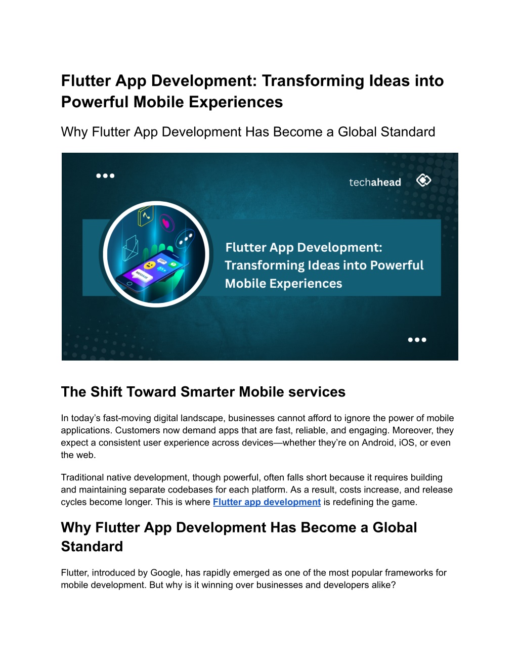 Flutter App Development: Transforming Ideas into Powerful Mobile Experiences Why Flutter App Development Has Become a Global Standard The Shift Toward Smarter Mobile services In today’s fast-moving digital landscape, businesses cannot afford to ignore the power of mobile applications. Customers now demand apps that are fast, reliable, and engaging. Moreover, they expect a consistent user experience across devices—whether they’re on Android, iOS, or even the web. Traditional native development, though powerful, often falls short because it requires building and maintaining separate codebases for each platform. As a result, costs increase, and release cycles become longer. This is where Flutter app development is redefining the game. Why Flutter App Development Has Become a Global Standard Flutter, introduced by Google, has rapidly emerged as one of the most popular frameworks for mobile development. But why is it winning over businesses and developers alike?