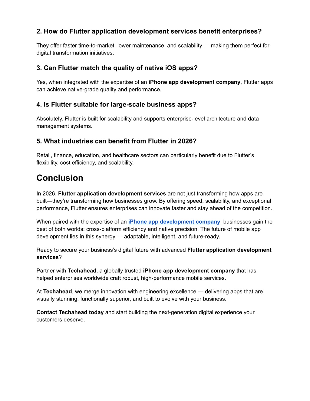 2. How do Flutter application development services benefit enterprises? They offer faster time-to-market, lower maintenance, and scalability — making them perfect for digital transformation initiatives. 3. Can Flutter match the quality of native iOS apps? Yes, when integrated with the expertise of an iPhone app development company, Flutter apps can achieve native-grade quality and performance. 4. Is Flutter suitable for large-scale business apps? Absolutely. Flutter is built for scalability and supports enterprise-level architecture and data management systems. 5. What industries can benefit from Flutter in 2026? Retail, finance, education, and healthcare sectors can particularly benefit due to Flutter’s flexibility, cost efficiency, and scalability. Conclusion In 2026, Flutter application development services are not just transforming how apps are built—they’re transforming how businesses grow. By offering speed, scalability, and exceptional performance, Flutter ensures enterprises can innovate faster and stay ahead of the competition. When paired with the expertise of an iPhone app development company, businesses gain the best of both worlds: cross-platform efficiency and native precision. The future of mobile app development lies in this synergy — adaptable, intelligent, and future-ready. Ready to secure your business’s digital future with advanced Flutter application development services? Partner with Techahead, a globally trusted iPhone app development company that has helped enterprises worldwide craft robust, high-performance mobile services. At Techahead, we merge innovation with engineering excellence — delivering apps that are visually stunning, functionally superior, and built to evolve with your business. Contact Techahead today and start building the next-generation digital experience your customers deserve.
