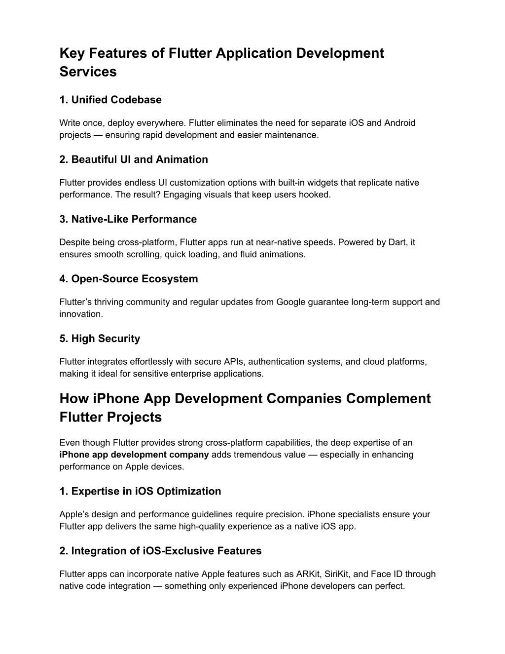 Key Features of Flutter Application Development Services 1. Unified Codebase Write once, deploy everywhere. Flutter eliminates the need for separate iOS and Android projects — ensuring rapid development and easier maintenance. 2. Beautiful UI and Animation Flutter provides endless UI customization options with built-in widgets that replicate native performance. The result? Engaging visuals that keep users hooked. 3. Native-Like Performance Despite being cross-platform, Flutter apps run at near-native speeds. Powered by Dart, it ensures smooth scrolling, quick loading, and fluid animations. 4. Open-Source Ecosystem Flutter’s thriving community and regular updates from Google guarantee long-term support and innovation. 5. High Security Flutter integrates effortlessly with secure APIs, authentication systems, and cloud platforms, making it ideal for sensitive enterprise applications. How iPhone App Development Companies Complement Flutter Projects Even though Flutter provides strong cross-platform capabilities, the deep expertise of an iPhone app development company adds tremendous value — especially in enhancing performance on Apple devices. 1. Expertise in iOS Optimization Apple’s design and performance guidelines require precision. iPhone specialists ensure your Flutter app delivers the same high-quality experience as a native iOS app. 2. Integration of iOS-Exclusive Features Flutter apps can incorporate native Apple features such as ARKit, SiriKit, and Face ID through native code integration — something only experienced iPhone developers can perfect.