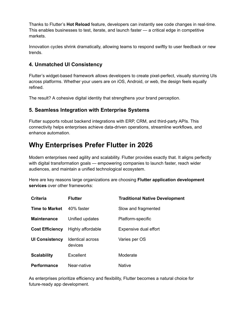 Thanks to Flutter’s Hot Reload feature, developers can instantly see code changes in real-time. This enables businesses to test, iterate, and launch faster — a critical edge in competitive markets. Innovation cycles shrink dramatically, allowing teams to respond swiftly to user feedback or new trends. 4. Unmatched UI Consistency Flutter’s widget-based framework allows developers to create pixel-perfect, visually stunning UIs across platforms. Whether your users are on iOS, Android, or web, the design feels equally refined. The result? A cohesive digital identity that strengthens your brand perception. 5. Seamless Integration with Enterprise Systems Flutter supports robust backend integrations with ERP, CRM, and third-party APIs. This connectivity helps enterprises achieve data-driven operations, streamline workflows, and enhance automation. Why Enterprises Prefer Flutter in 2026 Modern enterprises need agility and scalability. Flutter provides exactly that. It aligns perfectly with digital transformation goals — empowering companies to launch faster, reach wider audiences, and maintain a unified technological ecosystem. Here are key reasons large organizations are choosing Flutter application development services over other frameworks: Criteria Flutter Traditional Native Development Time to Market 40% faster Slow and fragmented Maintenance Unified updates Platform-specific Cost Efficiency Highly affordable Expensive dual effort UI Consistency Identical across Varies per OS devices Scalability Excellent Moderate Performance Near-native Native As enterprises prioritize efficiency and flexibility, Flutter becomes a natural choice for future-ready app development.