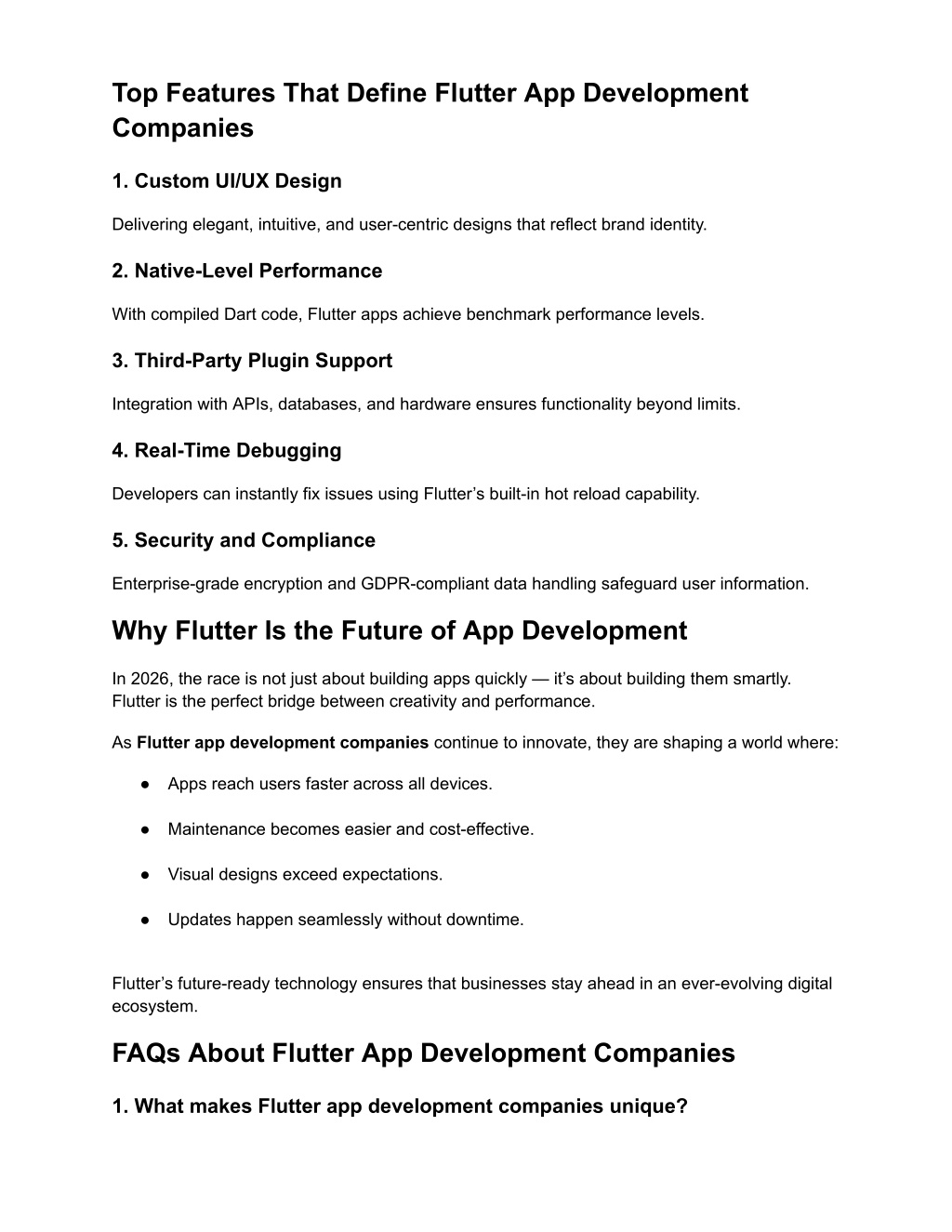 5. Top Features That Define Flutter App Development Companies 1. Custom UI/UX Design Delivering elegant, intuitive, and user-centric designs that reflect brand identity. 2. Native-Level Performance With compiled Dart code, Flutter apps achieve benchmark performance levels. 3. Third-Party Plugin Support Integration with APIs, databases, and hardware ensures functionality beyond limits. 4. Real-Time Debugging Developers can instantly fix issues using Flutter’s built-in hot reload capability. 5. Security and Compliance Enterprise-grade encryption and GDPR-compliant data handling safeguard user information. Why Flutter Is the Future of App Development In 2026, the race is not just about building apps quickly — it’s about building them smartly. Flutter is the perfect bridge between creativity and performance. As Flutter app development companies continue to innovate, they are shaping a world where: ● Apps reach users faster across all devices. ● Maintenance becomes easier and cost-effective. ● Visual designs exceed expectations. ● Updates happen seamlessly without downtime. Flutter’s future-ready technology ensures that businesses stay ahead in an ever-evolving digital ecosystem. FAQs About Flutter App Development Companies 1. What makes Flutter app development companies unique?