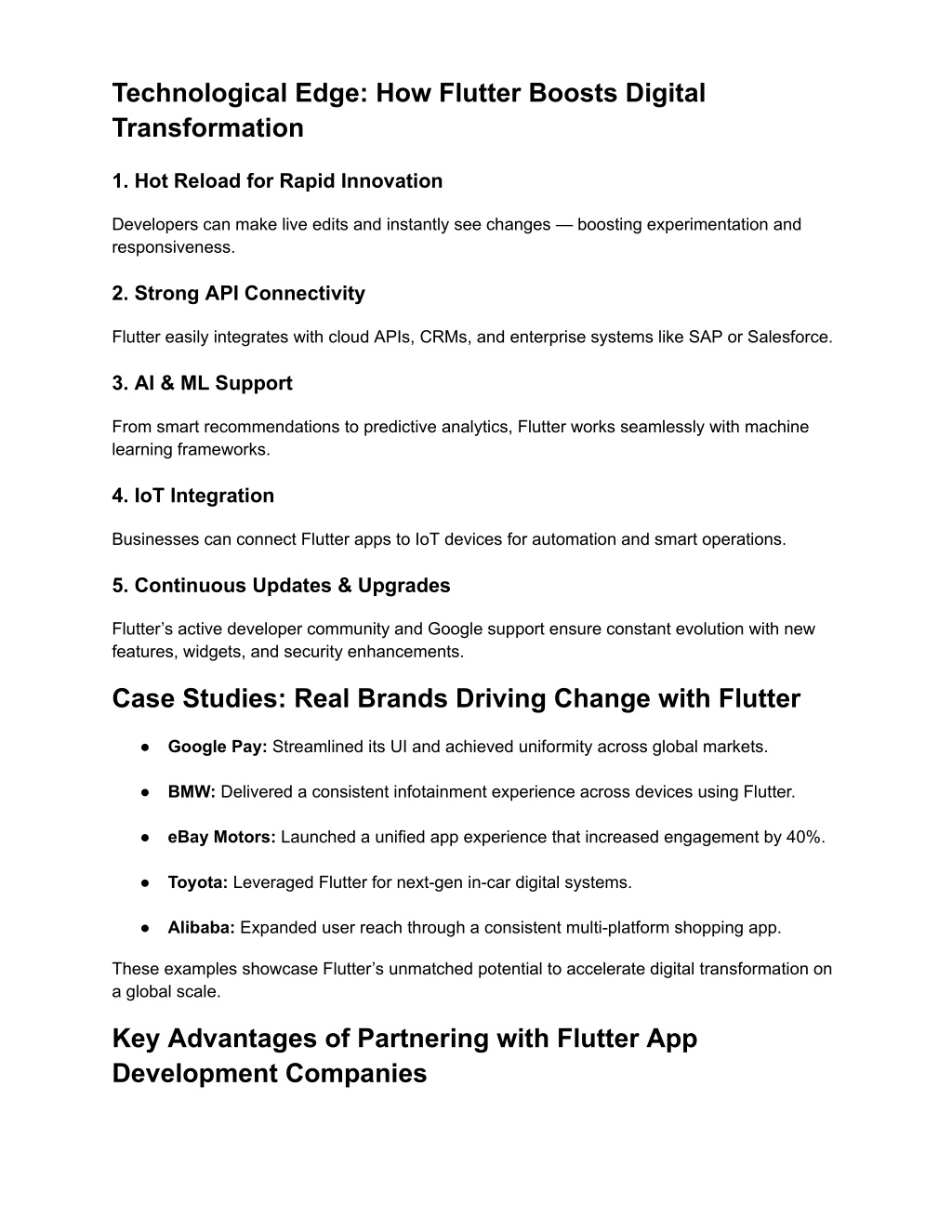 Technological Edge: How Flutter Boosts Digital Transformation 1. Hot Reload for Rapid Innovation Developers can make live edits and instantly see changes — boosting experimentation and responsiveness. 2. Strong API Connectivity Flutter easily integrates with cloud APIs, CRMs, and enterprise systems like SAP or Salesforce. 3. AI & ML Support From smart recommendations to predictive analytics, Flutter works seamlessly with machine learning frameworks. 4. IoT Integration Businesses can connect Flutter apps to IoT devices for automation and smart operations. 5. Continuous Updates & Upgrades Flutter’s active developer community and Google support ensure constant evolution with new features, widgets, and security enhancements. Case Studies: Real Brands Driving Change with Flutter ● Google Pay: Streamlined its UI and achieved uniformity across global markets. ● BMW: Delivered a consistent infotainment experience across devices using Flutter. ● eBay Motors: Launched a unified app experience that increased engagement by 40%. ● Toyota: Leveraged Flutter for next-gen in-car digital systems. ● Alibaba: Expanded user reach through a consistent multi-platform shopping app. These examples showcase Flutter’s unmatched potential to accelerate digital transformation on a global scale. Key Advantages of Partnering with Flutter App Development Companies