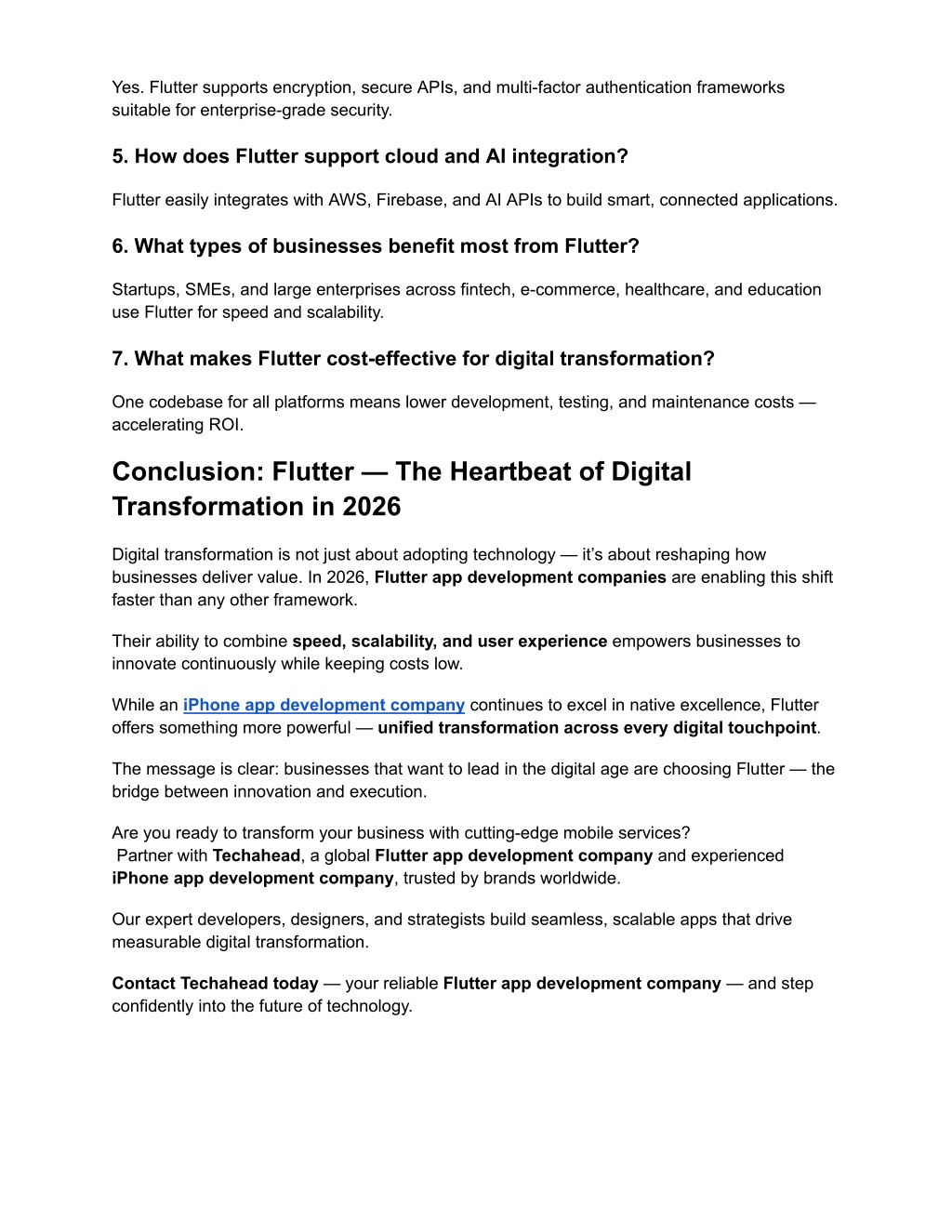 Yes. Flutter supports encryption, secure APIs, and multi-factor authentication frameworks suitable for enterprise-grade security. 5. How does Flutter support cloud and AI integration? Flutter easily integrates with AWS, Firebase, and AI APIs to build smart, connected applications. 6. What types of businesses benefit most from Flutter? Startups, SMEs, and large enterprises across fintech, e-commerce, healthcare, and education use Flutter for speed and scalability. 7. What makes Flutter cost-effective for digital transformation? One codebase for all platforms means lower development, testing, and maintenance costs — accelerating ROI. Conclusion: Flutter — The Heartbeat of Digital Transformation in 2026 Digital transformation is not just about adopting technology — it’s about reshaping how businesses deliver value. In 2026, Flutter app development companies are enabling this shift faster than any other framework. Their ability to combine speed, scalability, and user experience empowers businesses to innovate continuously while keeping costs low. While an iPhone app development company continues to excel in native excellence, Flutter offers something more powerful — unified transformation across every digital touchpoint. The message is clear: businesses that want to lead in the digital age are choosing Flutter — the bridge between innovation and execution. Are you ready to transform your business with cutting-edge mobile services? Partner with Techahead, a global Flutter app development company and experienced iPhone app development company, trusted by brands worldwide. Our expert developers, designers, and strategists build seamless, scalable apps that drive measurable digital transformation. Contact Techahead today — your reliable Flutter app development company — and step confidently into the future of technology.