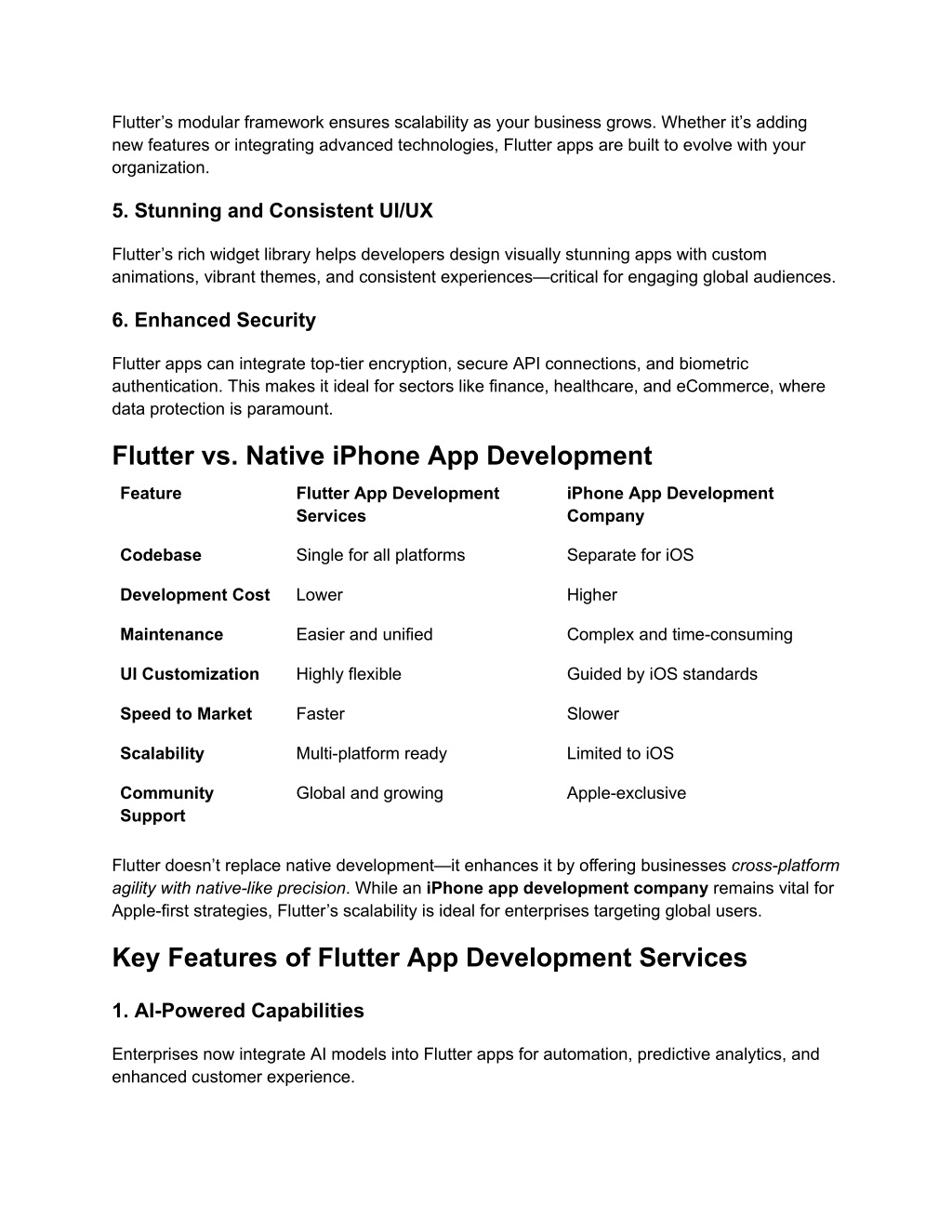 3. Flutter’s modular framework ensures scalability as your business grows. Whether it’s adding new features or integrating advanced technologies, Flutter apps are built to evolve with your organization. 5. Stunning and Consistent UI/UX Flutter’s rich widget library helps developers design visually stunning apps with custom animations, vibrant themes, and consistent experiences—critical for engaging global audiences. 6. Enhanced Security Flutter apps can integrate top-tier encryption, secure API connections, and biometric authentication. This makes it ideal for sectors like finance, healthcare, and eCommerce, where data protection is paramount. Flutter vs. Native iPhone App Development Feature Flutter App Development Services iPhone App Development Company Codebase Single for all platforms Separate for iOS Development Cost Lower Higher Maintenance Easier and unified Complex and time-consuming UI Customization Highly flexible Guided by iOS standards Speed to Market Faster Slower Scalability Multi-platform ready Limited to iOS Community Support Global and growing Apple-exclusive Flutter doesn’t replace native development—it enhances it by offering businesses cross-platform agility with native-like precision. While an iPhone app development company remains vital for Apple-first strategies, Flutter’s scalability is ideal for enterprises targeting global users. Key Features of Flutter App Development Services 1. AI-Powered Capabilities Enterprises now integrate AI models into Flutter apps for automation, predictive analytics, and enhanced customer experience.