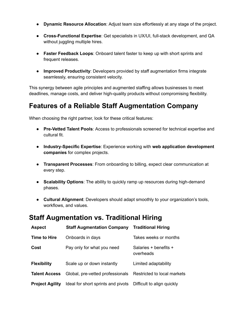 ● Dynamic Resource Allocation: Adjust team size effortlessly at any stage of the project. ● Cross-Functional Expertise: Get specialists in UX/UI, full-stack development, and QA without juggling multiple hires. ● Faster Feedback Loops: Onboard talent faster to keep up with short sprints and frequent releases. ● Improved Productivity: Developers provided by staff augmentation firms integrate seamlessly, ensuring consistent velocity. This synergy between agile principles and augmented staffing allows businesses to meet deadlines, manage costs, and deliver high-quality products without compromising flexibility. Features of a Reliable Staff Augmentation Company When choosing the right partner, look for these critical features: ● Pre-Vetted Talent Pools: Access to professionals screened for technical expertise and cultural fit. ● Industry-Specific Expertise: Experience working with web application development companies for complex projects. ● Transparent Processes: From onboarding to billing, expect clear communication at every step. ● Scalability Options: The ability to quickly ramp up resources during high-demand phases. ● Cultural Alignment: Developers should adapt smoothly to your organization’s tools, workflows, and values. Staff Augmentation vs. Traditional Hiring Aspect Staff Augmentation CompanyTraditional Hiring Time to Hire Onboards in days Takes weeks or months Cost Pay only for what you need Salaries + benefits + overheads Flexibility Scale up or down instantly Limited adaptability Talent Access Global, pre-vetted professionals Restricted to local markets Project Agility Ideal for short sprints and pivots Difficult to align quickly