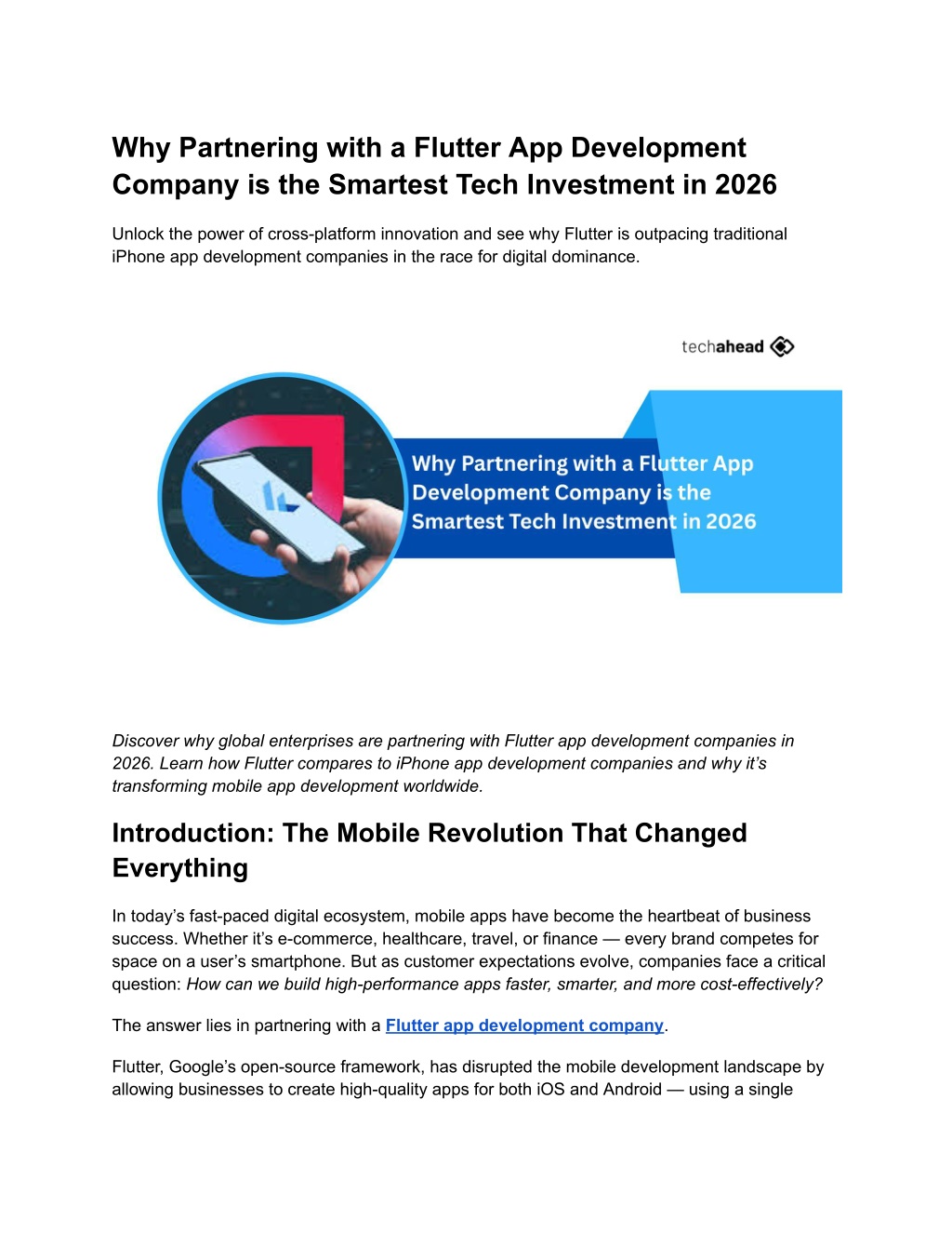 6. 1. What makes a Flutter app development company different from traditional developers? A Flutter app development company specializes in cross-platform development, enabling faster delivery, reduced costs, and consistent performance across devices. 2. Is Flutter better than hiring an iPhone app development company? If your business targets both Android and iOS users, Flutter is more efficient. However, if your audience is exclusively iOS-based, an iPhone app development company may still be ideal. 3. Can Flutter apps match native app performance? Yes. Flutter’s native compilation and rendering engine deliver near-native speed and responsiveness. 4. What industries benefit most from Flutter app development? E-commerce, fintech, healthcare, and education sectors see significant gains from Flutter’s flexibility and scalability. 5. Is Flutter future-proof for businesses? Absolutely. With Google’s continued investment and growing community support, Flutter is poised to dominate mobile and web development for years to come. Conclusion: The Power of Choosing the Right Flutter Partner The shift toward cross-platform innovation is unstoppable. Businesses that adapt now will gain a lasting competitive edge. A trusted Flutter app development company can help you build scalable, cost-efficient, and visually engaging apps that captivate users on every device. While an iPhone app development company still plays a role in native innovation, Flutter is clearly the more strategic choice for businesses that demand flexibility and speed. At TechAhead, we blend innovation with precision to craft exceptional digital experiences. As a globally recognized Flutter app development company and trusted iPhone app development company, we empower businesses to create high-performance apps that drive engagement and growth. Let’s turn your vision into a scalable, cross-platform reality. Connect with TechAhead today and elevate your app strategy for 2026 and beyond. Visit TechAhead to start your Flutter journey.