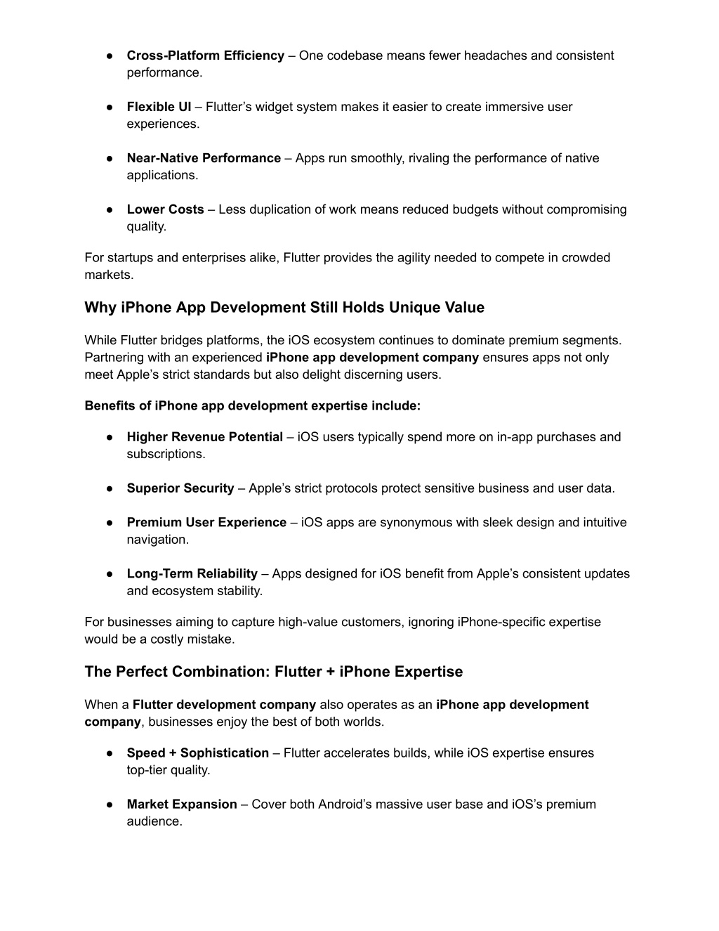 ● Cross-Platform Efficiency – One codebase means fewer headaches and consistent performance. ● Flexible UI – Flutter’s widget system makes it easier to create immersive user experiences. ● Near-Native Performance – Apps run smoothly, rivaling the performance of native applications. ● Lower Costs – Less duplication of work means reduced budgets without compromising quality. For startups and enterprises alike, Flutter provides the agility needed to compete in crowded markets. Why iPhone App Development Still Holds Unique Value While Flutter bridges platforms, the iOS ecosystem continues to dominate premium segments. Partnering with an experienced iPhone app development company ensures apps not only meet Apple’s strict standards but also delight discerning users. Benefits of iPhone app development expertise include: ● Higher Revenue Potential – iOS users typically spend more on in-app purchases and subscriptions. ● Superior Security – Apple’s strict protocols protect sensitive business and user data. ● Premium User Experience – iOS apps are synonymous with sleek design and intuitive navigation. ● Long-Term Reliability – Apps designed for iOS benefit from Apple’s consistent updates and ecosystem stability. For businesses aiming to capture high-value customers, ignoring iPhone-specific expertise would be a costly mistake. The Perfect Combination: Flutter + iPhone Expertise When a Flutter development company also operates as an iPhone app development company, businesses enjoy the best of both worlds. ● Speed + Sophistication – Flutter accelerates builds, while iOS expertise ensures top-tier quality. ● Market Expansion – Cover both Android’s massive user base and iOS’s premium audience.