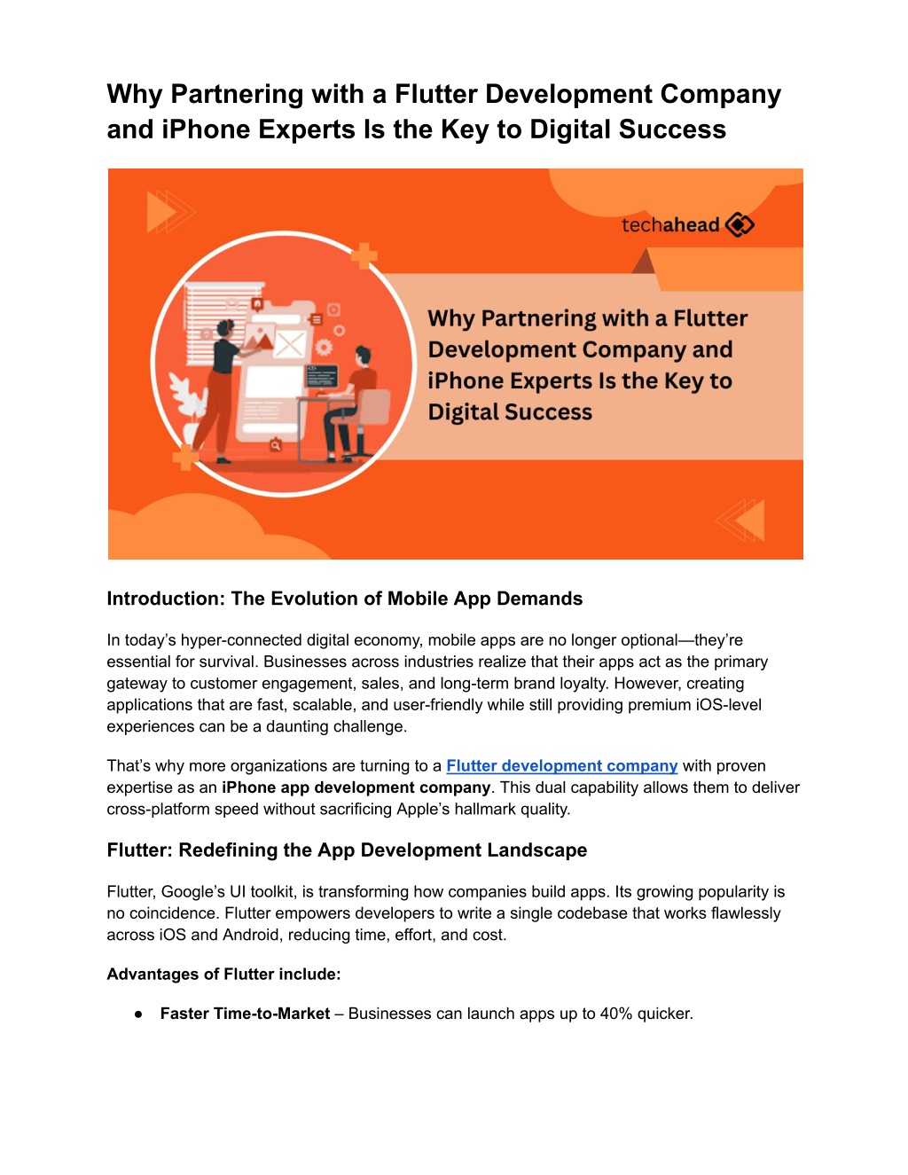 Transitioning to Tomorrow: Why Businesses Need This Now The demand for apps will only grow in 2025 and beyond. Flutter provides the agility businesses crave, while iPhone app expertise guarantees the premium edge users expect. Together, they represent the formula for sustained success in a digital-first world. Those who adopt this combined strategy today will gain a critical edge tomorrow—outpacing competitors, delighting users, and driving revenue growth. FAQs Q1: Why choose a Flutter development company with iPhone app expertise? Because it combines the speed and scalability of Flutter with the premium design and security features of iOS. Q2: How cost-effective is Flutter for startups? Flutter allows startups to build for iOS and Android with one codebase, saving up to 50% of development costs. Q3: Can Flutter apps match the performance of native iOS apps? Yes, when developed by experts with iPhone app development knowledge, Flutter apps can achieve near-native performance. Q4: Which industries should prioritize dual expertise in app development? Industries like healthcare, fintech, retail, education, and hospitality gain the most by combining cross-platform and iOS excellence. Q5: What should I consider before hiring a Flutter development company? Review portfolios, check iOS expertise, confirm agile methodologies, and evaluate post-launch support. Conclusion In an increasingly mobile-first market, the smartest businesses won’t settle for “either-or.” They’ll embrace both: the scalability of a Flutter development company and the precision of an iPhone app development company. This combination ensures faster development cycles, wider reach, and apps that consistently exceed user expectations. The companies that act now will be best positioned to lead tomorrow’s digital economy. At TechAhead, we unite the speed of Flutter with the sophistication of iPhone app development. Whether you’re a startup or an enterprise, our team builds future-ready apps designed to scale, secure, and succeed. Let’s transform your vision into a world-class mobile experience.
