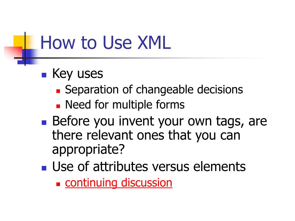 How to Use XML • Key uses • Separation of changeable decisions • Need for multiple forms • Before you invent your own tags, are there relevant ones that you can appropriate? • Use of attributes versus elements • continuing discussion