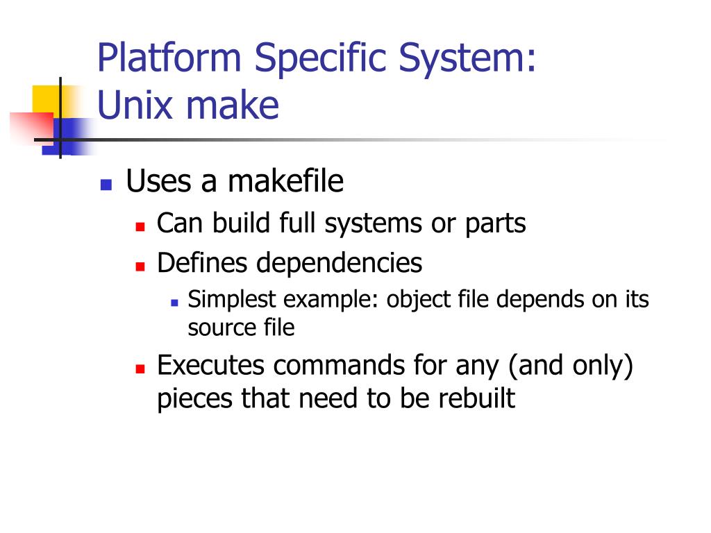 Platform Specific System: Unix make • Uses a makefile • Can build full systems or parts • Defines dependencies • Simplest example: object file depends on its source file • Executes commands for any (and only) pieces that need to be rebuilt