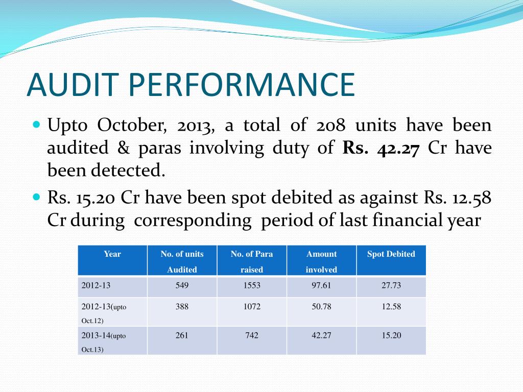 AUDIT PERFORMANCE • Upto October, 2013, a total of 208 units have been audited & paras involving duty of Rs. 42.27 Cr have been detected. • Rs. 15.20 Cr have been spot debited as against Rs. 12.58 Cr during corresponding period of last financial year
