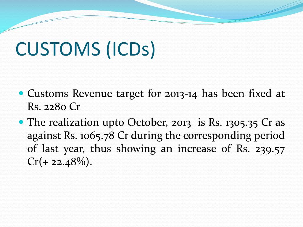 CUSTOMS (ICDs) • Customs Revenue target for 2013-14 has been fixed at Rs. 2280 Cr • The realization upto October, 2013 is Rs. 1305.35 Cr as against Rs. 1065.78 Cr during the corresponding period of last year, thus showing an increase of Rs. 239.57 Cr(+ 22.48%).
