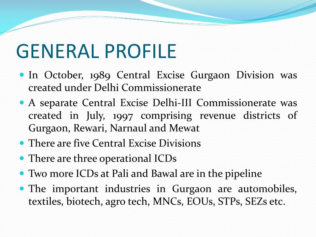 GENERAL PROFILE • In October, 1989 Central Excise Gurgaon Division was created under Delhi Commissionerate • A separate Central Excise Delhi-III Commissionerate was created in July, 1997comprising revenue districts of Gurgaon, Rewari, Narnaul and Mewat • There are five Central Excise Divisions • There are three operational ICDs • Two more ICDs at Pali and Bawal are in the pipeline • The important industries in Gurgaonare automobiles, textiles, biotech, agro tech, MNCs, EOUs, STPs, SEZs etc.