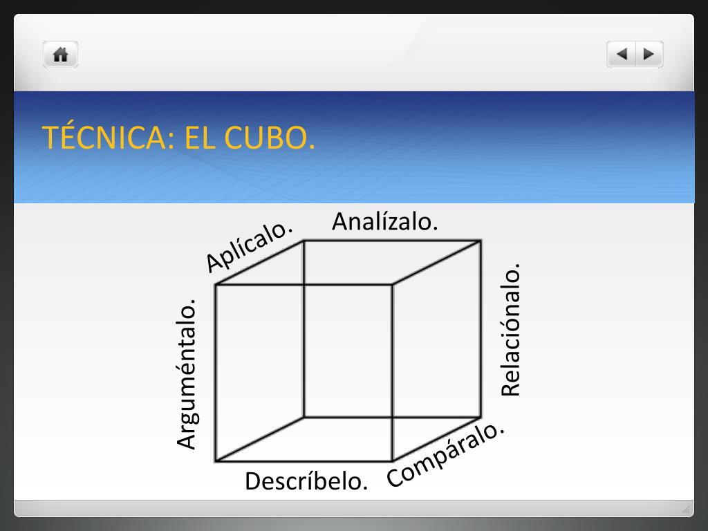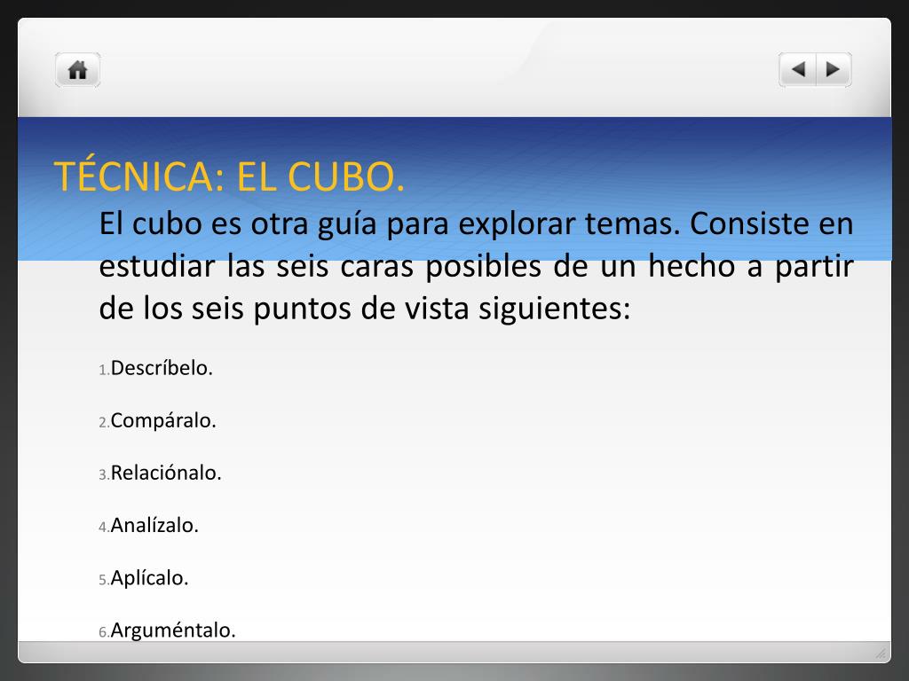 TÉCNICA: EL CUBO. El cubo es otra guía para explorar temas. Consiste en estudiar las seis caras posibles de un hecho a partir de los seis puntos de vista siguientes: • Descríbelo. • Compáralo. • Relaciónalo. • Analízalo. • Aplícalo. • Arguméntalo.