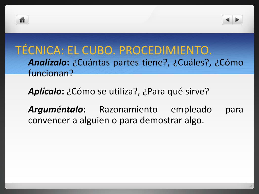 TÉCNICA: EL CUBO. PROCEDIMIENTO. Analízalo: ¿Cuántas partes tiene?, ¿Cuáles?, ¿Cómo funcionan? Aplícalo: ¿Cómo se utiliza?, ¿Para qué sirve? Arguméntalo:Razonamiento empleado para convencer a alguien o para demostrar algo.
