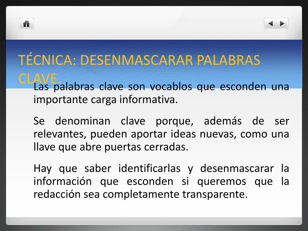 TÉCNICA: DESENMASCARAR PALABRAS CLAVE. Las palabras clave son vocablos que esconden una importante carga informativa. Se denominan clave porque, además de ser relevantes, pueden aportar ideas nuevas, como una llave que abre puertas cerradas. Hay que saber identificarlas y desenmascarar la información que esconden si queremos que la redacción sea completamente transparente.